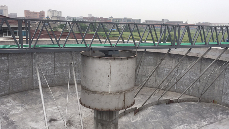 工作橋由安裝在周邊的驅動機構帶動,繞安裝在池中心支墩上的中心支座旋轉。懸掛在工作橋下的掛臂拖動刮泥板旋轉,沉淀在池底的污泥由刮泥板收集至中央集泥坑。液面上的浮渣在浮渣刮板和周邊擋渣板形成的漸縮區域內集中,由浮渣刮板刮至集渣斗,排出池外。